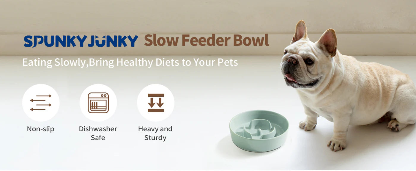 Introducing SpunkyJunky® Slow Feeder Dog Bowl that will challenge your gobbled pup and keep them entertained for a long time! This new ceramic bowl helps slow down mealtime for better digestion and healthier eating habits. Bring home this ceramic slow feeder dog bowl today and give your dog a treat!