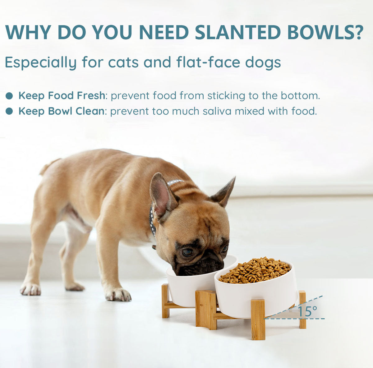 15° Slanted Ceramic Bowl Set with Wooden Stand | Tilted Food & Water Bowl